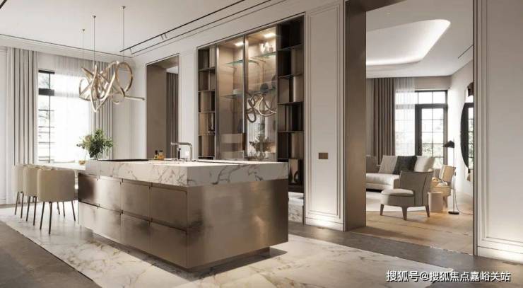 在厨房的设计中依然沿袭客厅的设计采用大理石元素,通过金属元素与大理石元素的结合来表现空间的轻奢,其中金属的岛台加上大理石台面让空间极具氛围感,让空间看上去更有层次。