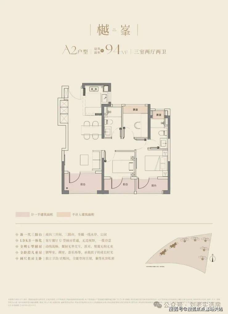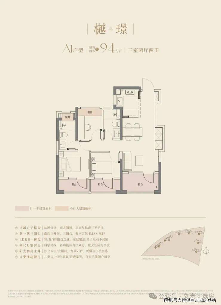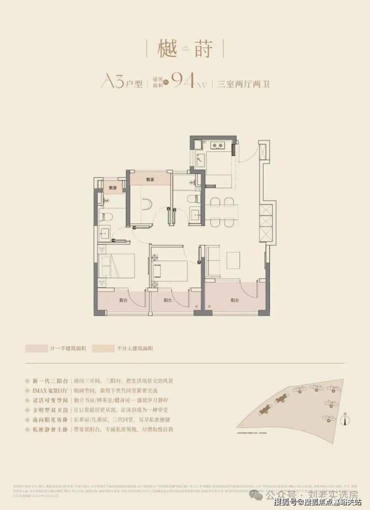 大华望樾建面约94㎡高层户型居然做到了 三阳台 的配置,远远超过新规标准。
