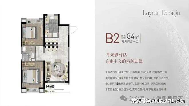 建面约84㎡2房2厅1卫,做到了双开间朝南+双卧室带飘窗+动静分离,非常宽敞的2房户型。