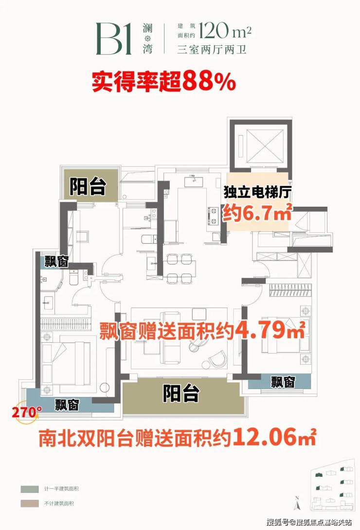 建面120 ㎡B1户型, 约12㎡南北双阳台空间 ,阳台“买1赠1”, 赠送约6㎡ ,次卧拓展后都有舒适尺度,更附赠约4.79㎡飘窗,实得率超 88% 。