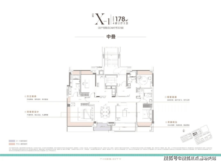 中平户型以四开间朝南的IMAX级采光面,打造出堪比市区豪宅的尺度感。4房4飘窗2阳台的设计,配合双套房布局,一共有三个套房,让每个家庭成员都享有独立私密空间。