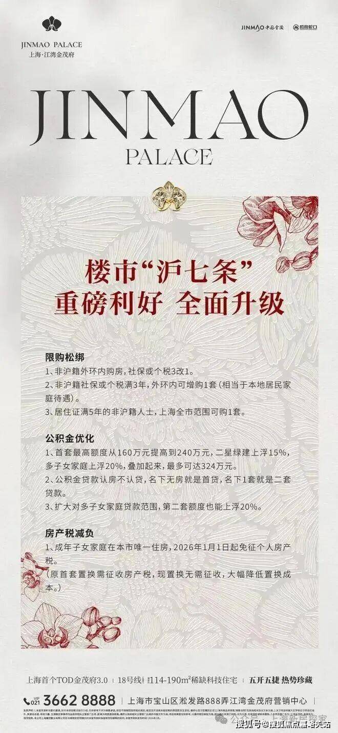 江湾金茂府售楼处电话400-856-9058“沪七条”重磅落地——限购松绑、公积金提额、房产税减负,三箭齐发。这是近年来上海楼市力度最大、覆盖面最广的一次政策调整,也被业内视为今年“小阳春”的最强催化剂。当购房门槛降低、置换成本减少、购买力释放,真正能承接这轮行情的,必须是那些具备“终极置业”属性的项目。江湾金茂府售楼处电话400-856-9058
