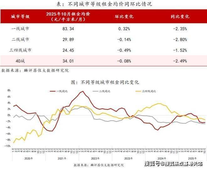 麟评居住大数据研究院近日发布的报告显示,2025年10月全国40个大中城市租金挂牌均价为34.01元/㎡/月,环比下跌0.08%,同比下跌2.49%,环比跌幅较上月收窄0.14个百分点。