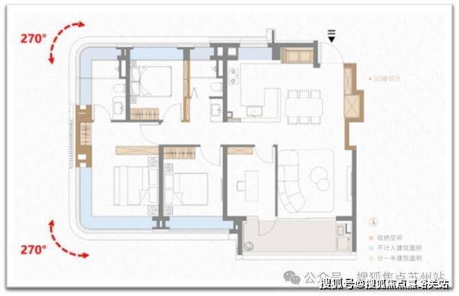 第三处山墙s墙的技术含量更高,直接让户型拥有两个大转角飘窗(主卧+主卫均双270°弧形转角飘窗)。凹处填放一个衣柜,视觉效果舒适,业主第一眼无知无觉,殊不知背后大有玄妙。
