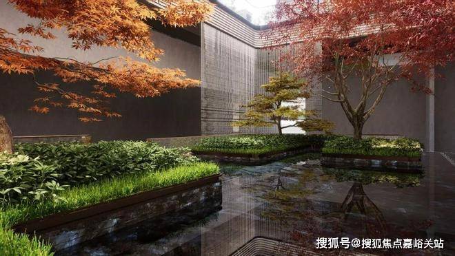 下沉式庭院宽约18米、进深约9.5米,通过水帘连通上下景观, 水晶砖景墙与层层叠形成视觉焦点,夜晚灯光下宛如艺术馆。
