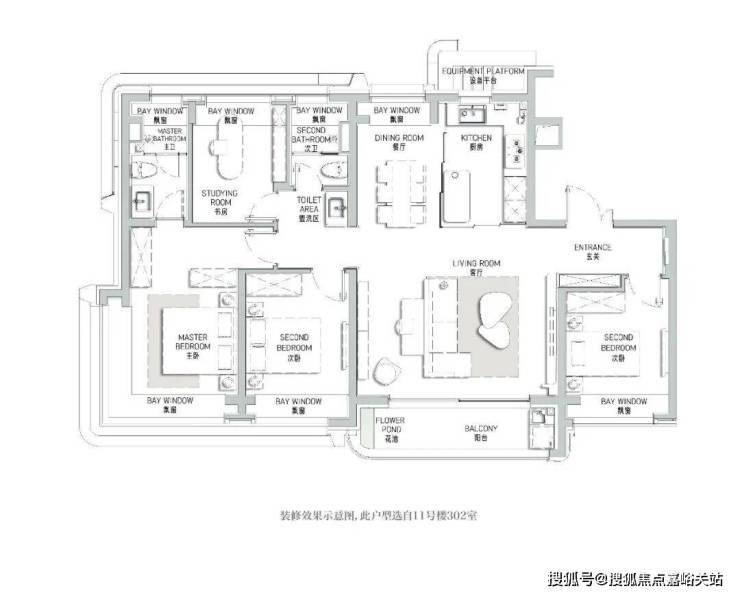 建面约120㎡的户型 ,定制LDKB一体化宽厅,更舒适的功能定制, 270°转角窗观景套房 设计,实现了居住品质与观景的完美结合。