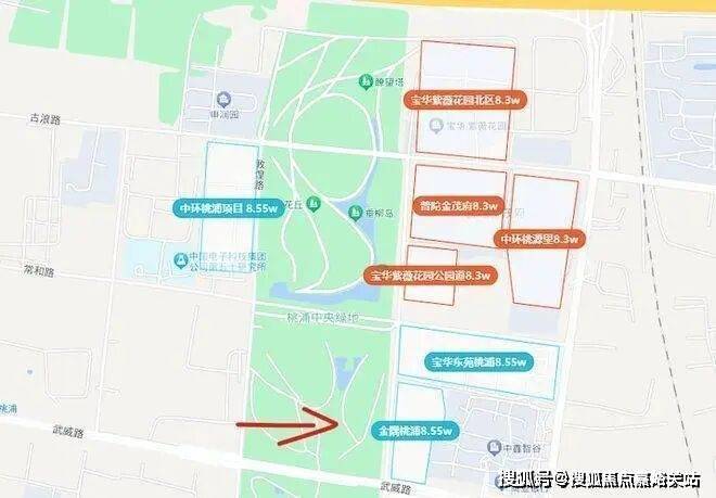 整个项目包含两个地块,地理位置就在宝华紫薇之星南侧,联动价8.55万元/㎡。这块地是2023年四批次土拍时由金隅地产拿下,也是紧挨桃浦绿地的景观房。