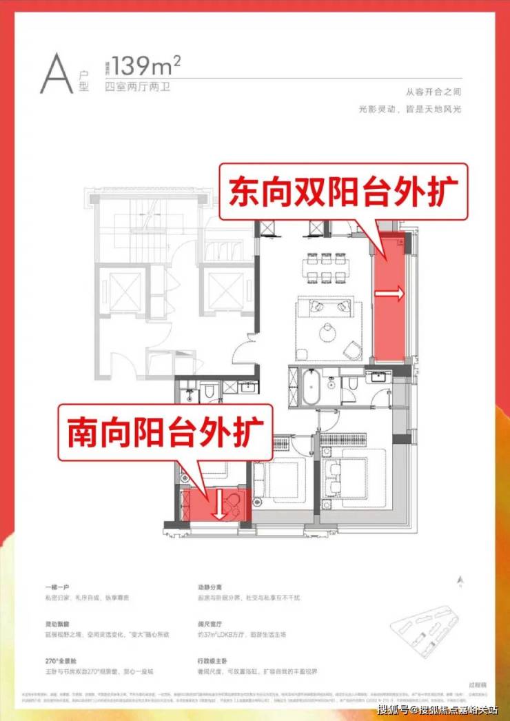 更大尺度的约139㎡4房,更是做到三阳台设计 ——超大观景阳台与约5.7米大横厅打通后,形成堪比150㎡户型的大方厅,家庭聚会、孩子嬉戏都有充足空间,南次卧同样可借阳台拓展,舒适度再升级。