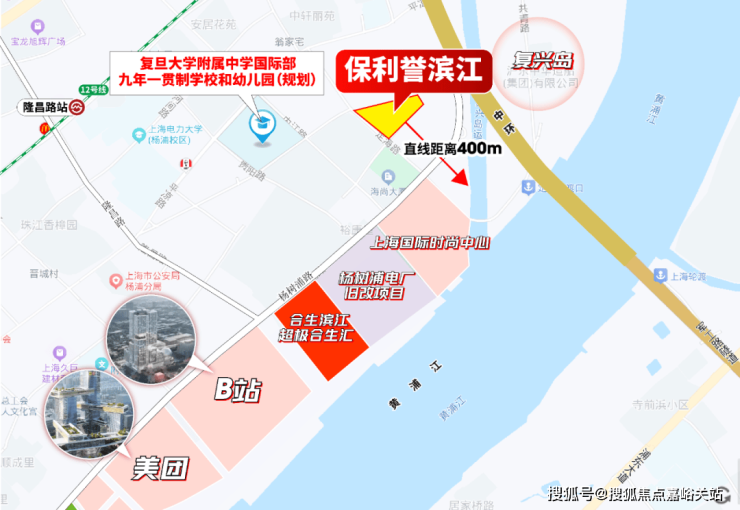 谈及杨浦滨江新盘,“地段同质化”是普遍痛点——多数项目仅共享滨江资源,难有独特价值锚点。但保利誉滨江走出了差异化路径:直线距黄浦江约400米、复兴岛约300米,左手承接科创大厂红利,右手占据复兴岛未来爆点。