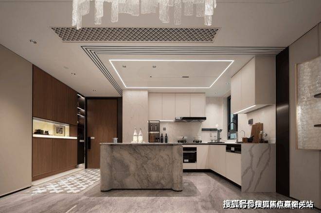 开门采用完美系列水波纹玻璃加上金属造型边框的玻璃移门,✅✅海上清和玺售楼处电话:400 - 8824 - 258✅✅时尚又大气。顶部配置线性凉霸、LED 嵌入式回形灯带和筒灯,烹饪时光也变得无比美妙。