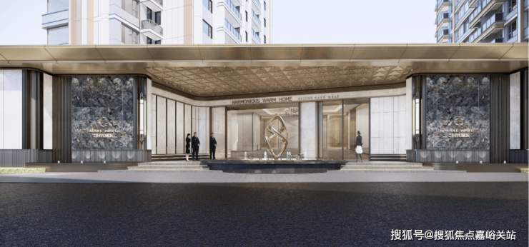 同时,入户大堂立面造型延续了主立面的框与线结合,飘顶弧形雨棚,组成高定入户大堂,增加入户仪式感。