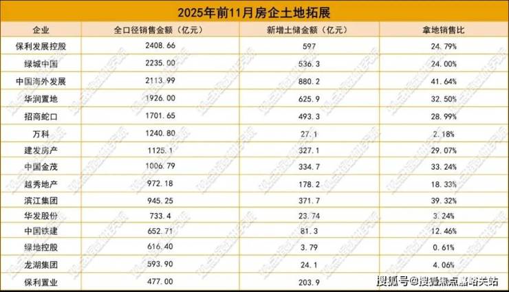 从拿地销售比来看,2025年1-11月房企拿地销售比同比回升明显,其中全口径销售前三的保利发展控股、绿城中国、中海地产,今年前11月拿地销售比和上年相比分别回升5.90、6.30和25个百分点。