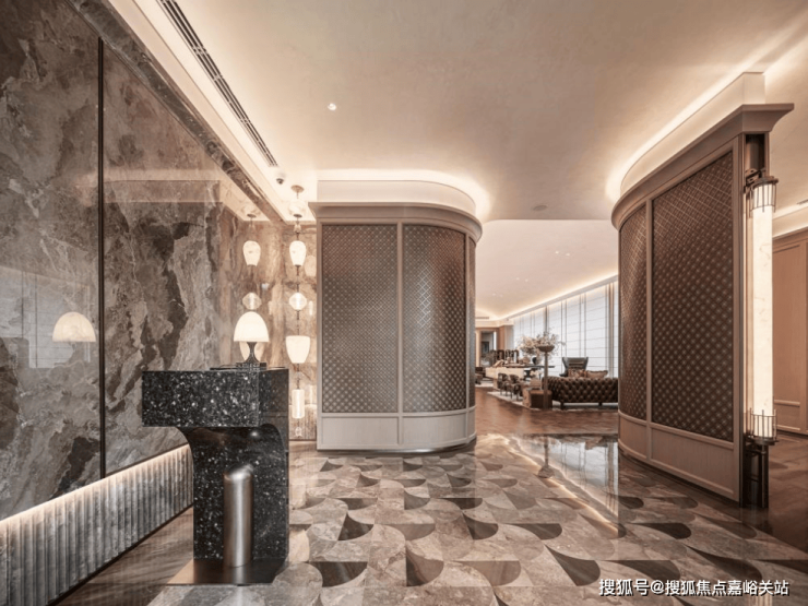 在主材上, 项目采用了沙漠风与白海棠石材,本就质感出众的进口石材,招商还运用了非常复杂的工艺进行雕琢:
