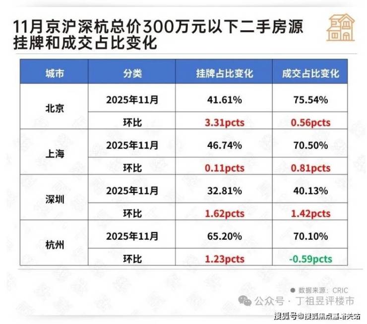 当下的二手房市场整体表现出“量增价跌、结构分化”的特征。重点城市二手房成交环比14%,前11月累计同比正增3%,结合国家统计局70城房价中二手房表现来看,房价环比上涨的城市数量已连续三个月为零。“以价换量”获得了成交量的回应,有买才有卖,这也推动了低总价房源房东挂牌积极性回升,不过由于惜售和观望情绪影响,买卖双方已进入新一轮博弈。