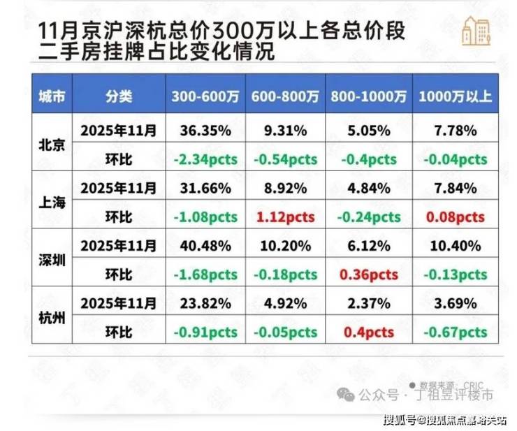 数据显示,京沪深杭300万-600万元刚改中改总价段新增挂牌占比出现了稳步回落,其中北京该价格段挂牌占比降幅最明显,环比下降2.34个百分点。