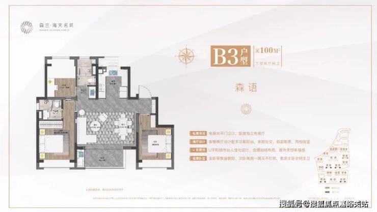 森兰海天名筑售楼处电话:400-833-6309【售楼处电话】森兰海天名筑售楼处电话:400-833-6309【售楼处电话】1、建面约100㎡三房两厅两卫,市场主流户型。客餐横厅设计配多功能阳台,优势在于更大采光面和更好通风效果,把过道纳入到客厅和餐厅的空间中来,使整体空间得到更好的利用。