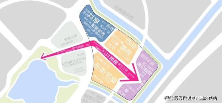 一条连续的公共通廊由海天湖公园引入社区,贯穿三大功能结构区。