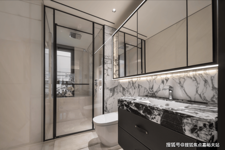 ✔卫生间地面和墙面整体性也非常强,奢石台面的纹路和岩板墙面和协调。