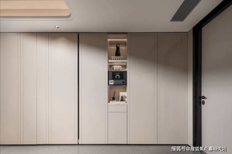 从电梯厅开始,就是酒店式定制化设计,弧形顶设计的电梯厅,门牌上设计了玉石托盘,可以放置家庭独有的摆件,注重仪式感的同时更具高定私享趣味性!