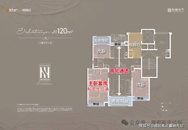 项目建面约120㎡户型也是 类独立电梯厅的设计,室内则是标准的 南北通透+三开间朝南设计;主卧套房配置,自带卫生间,私密性和舒适度俱佳。