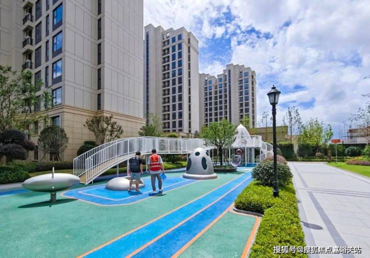 除了郁郁葱葱的树木、整齐美观的建筑,社区内部还有儿童乐园以及大面积水景,就连公区的地面都是用石材铺设的,细节之处也有不少紫铜元素的点缀。每一处都仿佛一幅风景画。