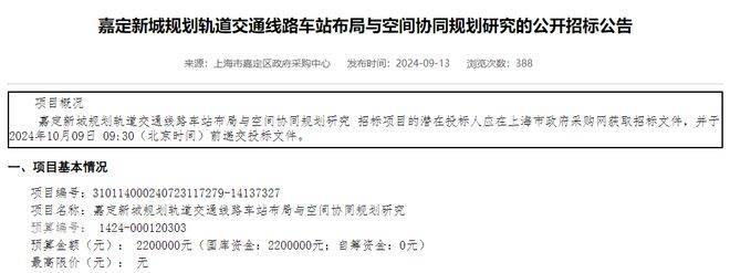 去年9月13日,上海政府采购网发布《嘉定新城规划轨道交通线路车站布局与空间协同规划研究的公开招标公告》。