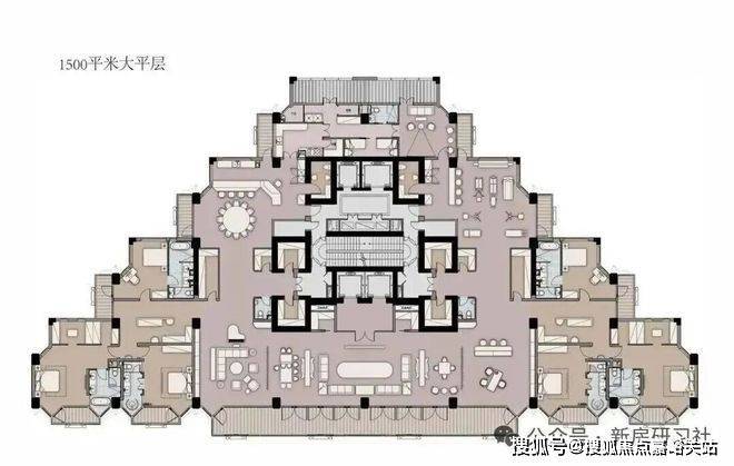 最豪气的还是这个整层一户 建面约1500㎡的大平层户型。它南向面宽达60米,有14个阳台!