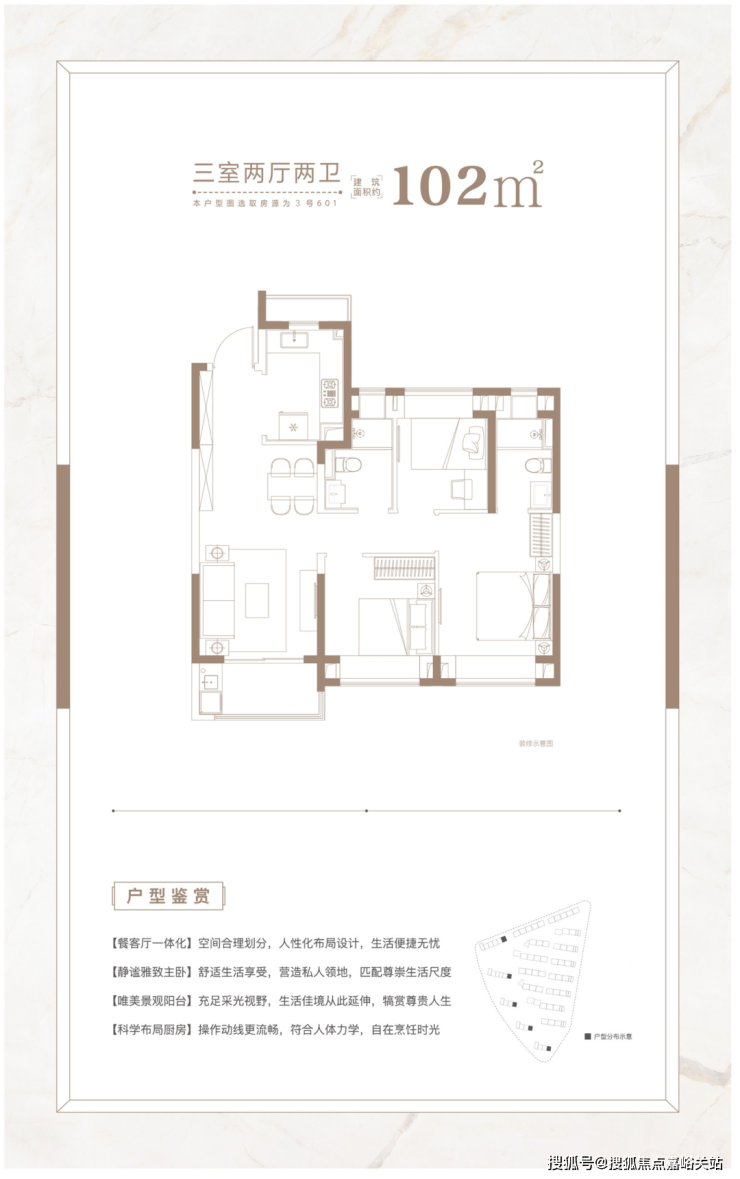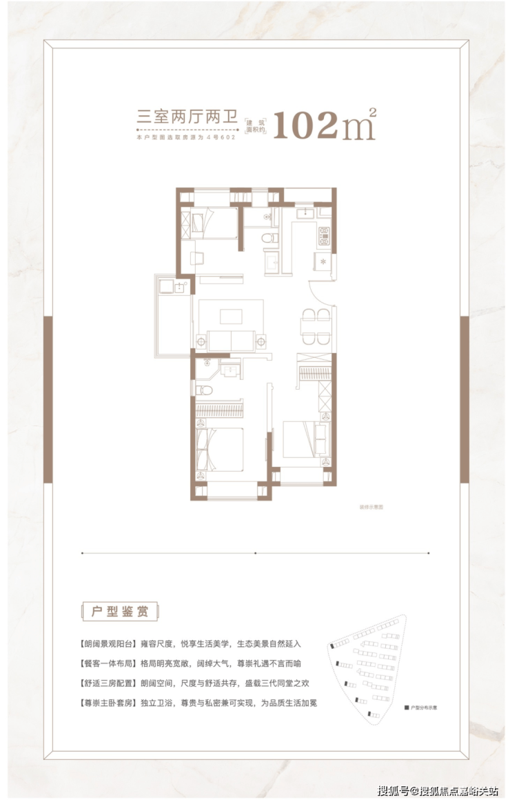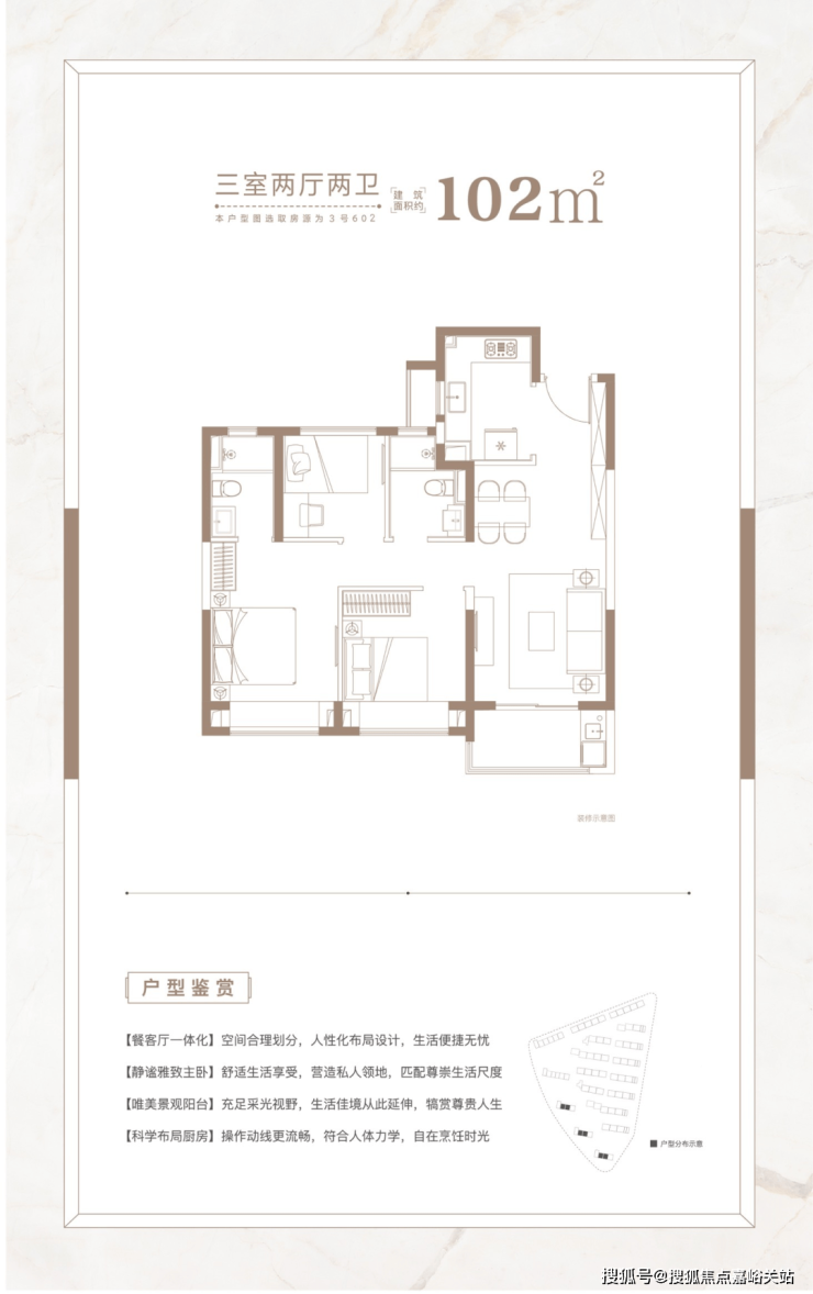 户型解析:三开间朝南+主卧套房设计+动静分离+全卧室带飘窗,采光优秀;厨房预留大尺度冰箱位;双卫设计,没有了“早高峰”的烦恼;主卧套房,尊享私密和奢阔尺度。舒适度和尺度感兼具,非常匹配精英家庭的生活追求!