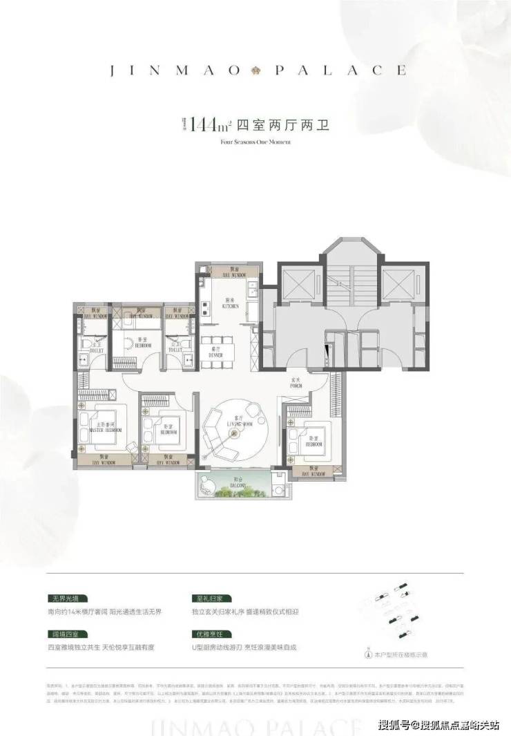 产品方面, 预计将推出建面约110-190㎡3至4房产品,四种户型的飘窗与阳台空间都比较大。 110㎡户型的阳台将次卧和客厅联通;123㎡是横厅设计;140㎡足足有七个飘窗空间;185㎡各个房间的空间更上一层。