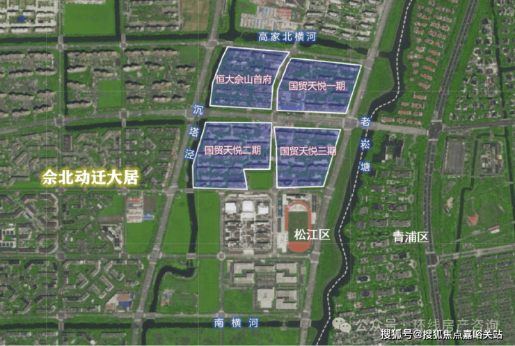 偏偏这块地不愿意认命,老老实实盖动迁房,造了恒大、国贸天悦和对岸的国贸佘山原墅等5个小区一起抱团取暖。