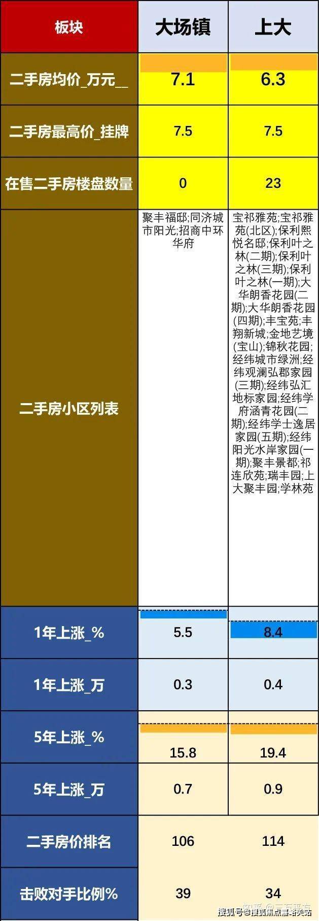 二手房是买卖双方”用脚投票“来证明版块的受欢迎程度。【二手房价格】决定了版块的整体能级。【二手房上涨比例】可以看出最近变化的趋势。