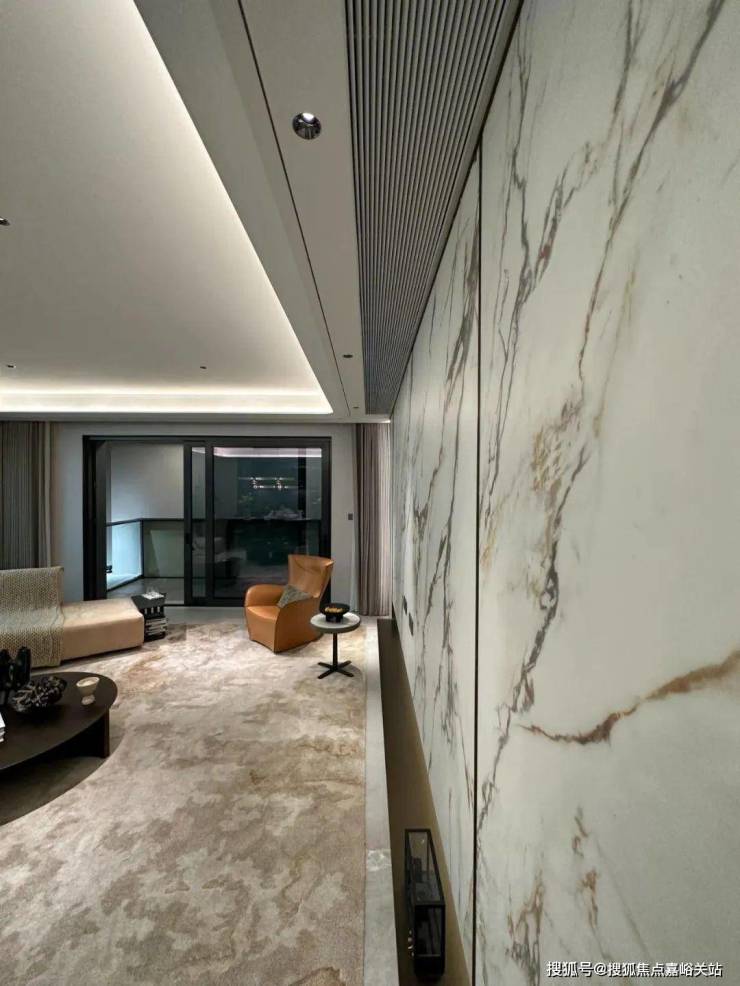这个是入户玄关处的地面,大理石地面搭配金属线条勾勒出玄关地界,归家的氛围感从这个区域就开始了~这还不是重点,玄关座椅背后,是一面皮革包裹的墙面。鞋柜下方做了悬浮处理,同样也是内嵌灯带,这里灯光的角度还会再调整,因为灯光映射在大理石地面上,要显得尽量柔和不刺眼;同时,鞋柜下方可放拖鞋,还能放扫地机器人,便于日常清扫打理。鞋柜的饰面,纹路方向统一,呈现出极强的协调感。橱柜作为强功能性的收纳系统,自然少不了操作性能上的考究,吊柜做了升降式的拉篮,以后再也不用爬上高凳拿取了。下方的橱柜则做了转角拉篮,充分利用转角空间,使物品井然有序的同时,轻松方便取放。水槽也是一个大单槽,放得下炒锅汤锅这种大物件~抽拉式龙头,清洗大水槽的时候很方便,360度旋转伸展自如,这款弯管还是硅胶材质,柔软耐用有弹性,还可切换出水模式,出来的水柱也是很柔和细腻不飞溅。厨房玻璃门是上轨道移门,意味着地面部分没有任何轨道,不会有灰尘积攒,炒菜时关上,避免油烟散入室内;平时拉开,可以扩充室内视觉感受。卫浴 缦云上海所有户型的所有卫生间里都用了悬浮式的洁具和柜体,确保了下方空间的打扫无死角,对未来的入住带来非常大的便利性!吉博力同层排水技术,静音是最大亮点;特制“水母”地漏,多重防臭防反溢。干净舒适的卫生间,是从空气到水流的全面把控~你们可以看下缦云上海是如何处理卫生间木门的防潮的——卫生间一侧用大理石做踢脚线,这是真正细致入微的巧思!主卧卫生间配备的电热毛巾架简直就是遇到潮冷节气的“福音”,让毛巾、内衣都能够提前加热干燥。层高 对于缦云上海的纯大宅社区定位,能买这样产品的购房者会非常在意空间感。缦云上海全部户型层高约3.3米,室内所有空间的门都做了通顶设计,更阔绰的居室空间,将生活格局有效放大,通风、采光和观景体验的全方位提升!弧形元素 缦云上海样板间里随处可见柔和的圆弧修饰,特别是柜体、墙体包边的圆弧转角,在进出各个空间时,减少磕碰的风险,对于有孩子和老人的家庭来说,是非常实用的友好设计。而且,门套做了弧形设计后,还叠加了金属线与墙纸做了分割,加强隔断界限感,提升室内家居精致度~比起中规中矩的直线,弧形施工工艺更复杂、造价更高,却多了几分灵动轻盈!这种弧形的元素不只是在样板间里,在售楼处也能经常看到,比如电梯厅。