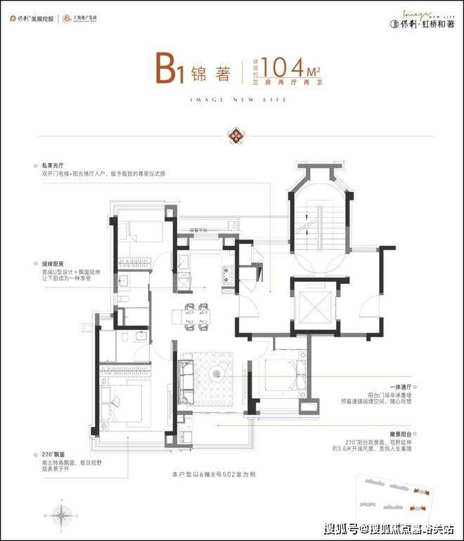 建面约104㎡3房,在建面94㎡小3房优点上,又进一步升级了尺度感, 约10.3m的南向面宽,为室内带来了出众的采光面和尺度感,这个户型无论从实用性、尺度感,亦或是视野、采光、私密性来说,都做得相当优秀。