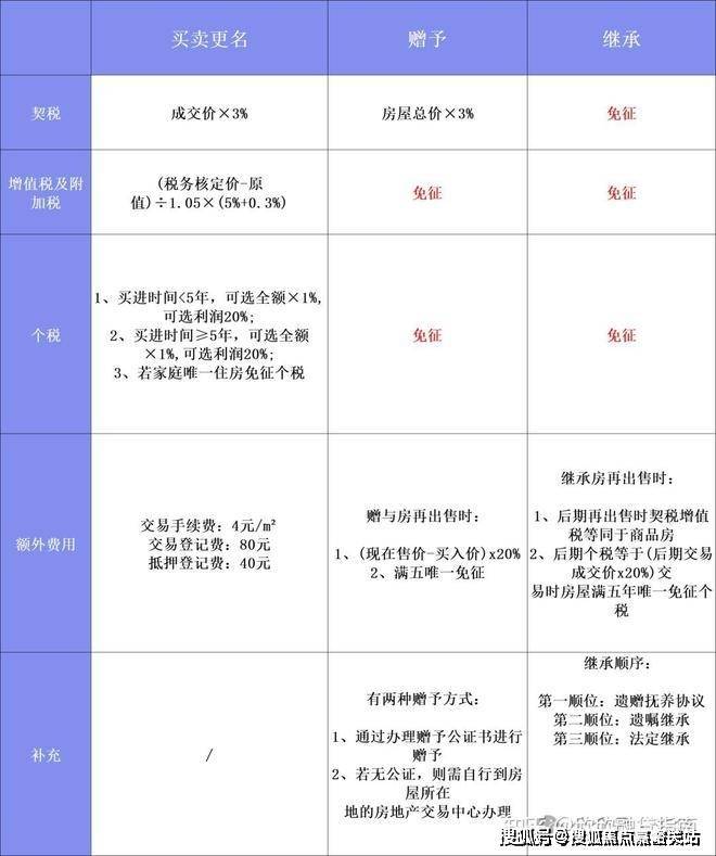 赠与:直系亲属赠与免增值税/个税,受赠方按3%全额缴纳契税;非直系赠与税费更高买卖:按正常交易缴纳增值税、契税、个税(标准同上)
