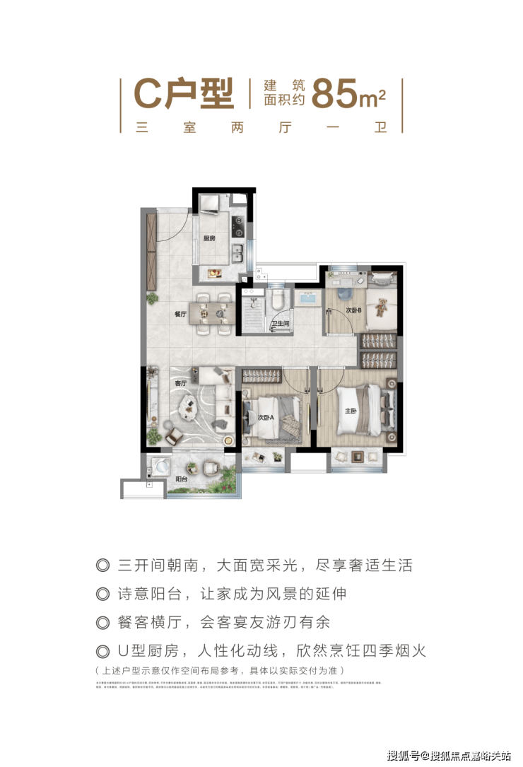 约85㎡的3房2厅1卫,三开间朝南+整体动静分离的设计,都保证了这个户型的居住舒适度。