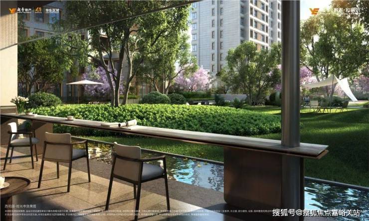 社区景观方面,作为上海首座和樾府,打造了“一半公园,一半城”,内部规划约9500m²公园绿岛,引水入园,水、木、石三重奢贵元素交织融合,形成多重园景,居住于此,可以悠然于内外双园谧境中。