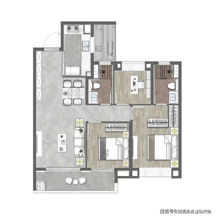 客餐厅相连,客厅+次卧南接双阳台,室内空间尺度感十足,整个采光面拉到极致。