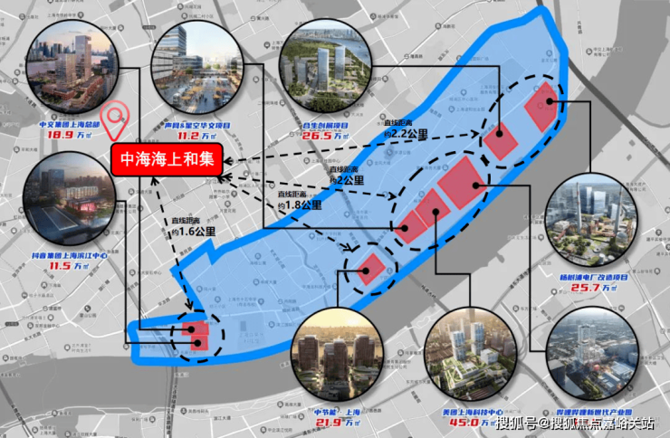 被誉为“北外滩三件套”的城市天际线组群,与「中海海上和集」直线距离仅约2公里左右。(数据来源:百度地图)