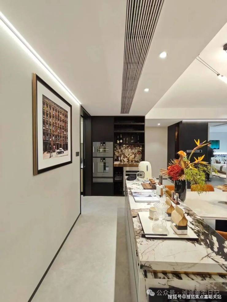 项目设计师的理念是“真正的奢华是自由”。超大的方厅,面积近50㎡,面宽约5.4 米。这里可以轻松实现电器柜、岛台、长桌、沙发、钢琴等丰富的生活场景。