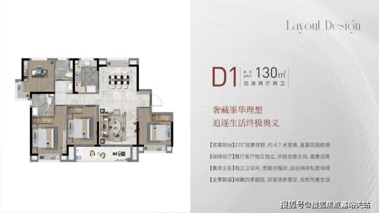建面约130㎡4房2厅2卫,做到了 四开间朝南+南北通透+主卧套房设计+双阳台设计+卫生间干湿分离,“一步到位”大4房,空间尺度非凡。