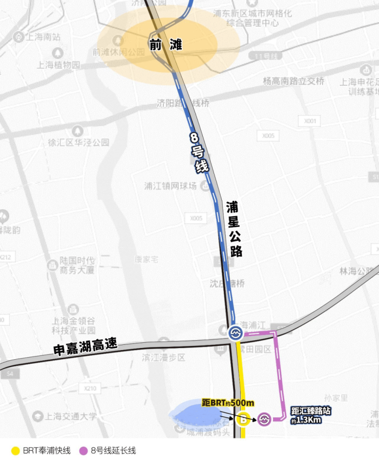 项目距离浦江线汇臻路站约1.3KM,5站即达沈杜公路站并与8号线换乘,可一线直达前滩。或通过BRT快线可一站无缝对接8号线沈杜公路!