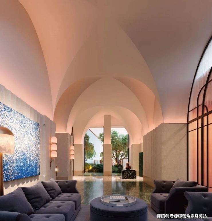 从九龙路起步,在繁花水岸的滨水步道上漫步归家;归家之路在滨水艺境另一侧,是约7000㎡的沉浸式邻里风貌街区,融合党群服务与邻里综合体业态,可在归家路途中感受精致烟火气;之后抵达九龙路归家主入口的河岸艺术大堂,两条地上细分动线,藏着不同的归家意趣:一条从主入口艺术大堂步入,沿着风雨连廊穿越花园小径,光影透过叶片洒落脚边,风携花香漫过肩头,仿佛逛完一场印象艺术展;另一条则经风雨连廊直抵“艺术品展列空间”泛会所,或许邂逅正在展出的私人藏品,在艺术氛围中完成圈层身份的过渡。最后步入电梯厅,半圆弧形天花吊顶暗合“天圆地方” 东方哲学,让归家终拾恢弘而宁静的仪式感。