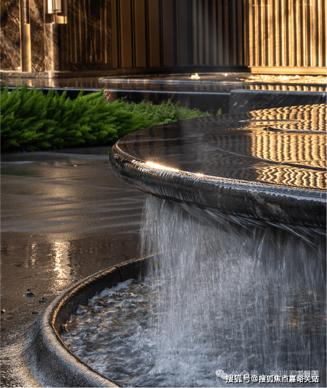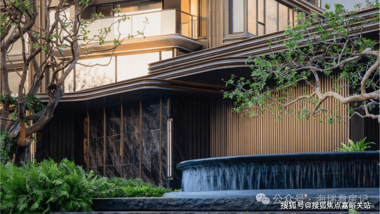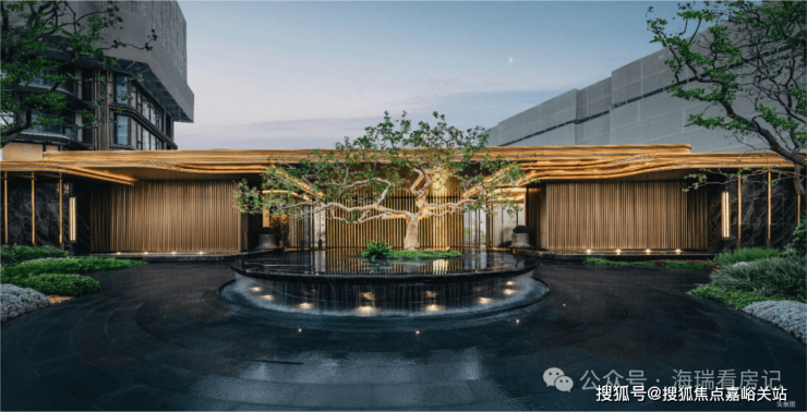 门庭隐现墨绿色泽的「璞熠琉璃」背景墙,经800℃高温淬炼,三十昼夜退火降温,无数遍打磨抛光,光影流转间熠熠生辉;特邀非遗传承人、福记世家第五代传承人夏志平,用十指抟砂古老手工艺独家定制的「璞釉艺陶」,搭配金属釉质感窑花纹理点缀,尽显温润高级。背后为呈现世间至美陶色,一片陶更历经了百次淬炼,配方调整,1280℃高温均匀铺釉。7.5m冠幅的百万级「百年冬青」,乃团队跨越6省17城,百次实地勘察,从近万棵名木中,万里挑一甄选而出,枝干苍劲充满力量;水盘池底的「流金银河」奢石,浓缩着来自宇宙的浪漫,以水刀行纹,让东方的银河让自上而下,层层倾泻。