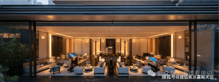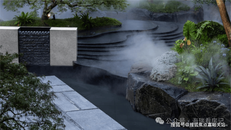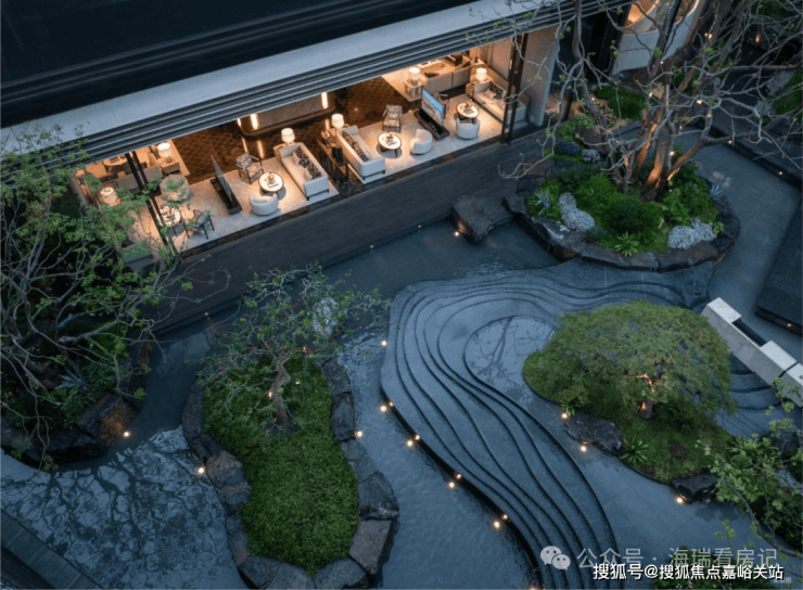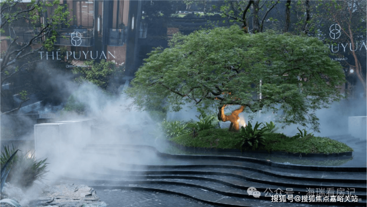 而实景首开的近2000㎡下沉庭院,作为“园林灵魂”,漫步此间,你会看见:乌金原石围合的“玉扣绿岛”上,低调静放着团队自“天下玉源”河南南阳历时遴选而来,近7000年的“国玉”独山璞玉,与山野林木共此氤氲灵气,尽显东方温润;从诗经走出来的近11m高参天乌桕,则再现古诗中所描述的“秋林城郭画图中,乌桕千株照眼红“的诗意;采用约6.7m幻影蓝奢石打造的“叠级水瀑”跌水台,池底以呈现天然墨绿色泽的蓝金刚石铺就,映水之澄明,境之悠远;连台阶都采用了“黑色花岗岩之王”安哥拉黑整石,沿云梯而上,让人返璞内心东方......