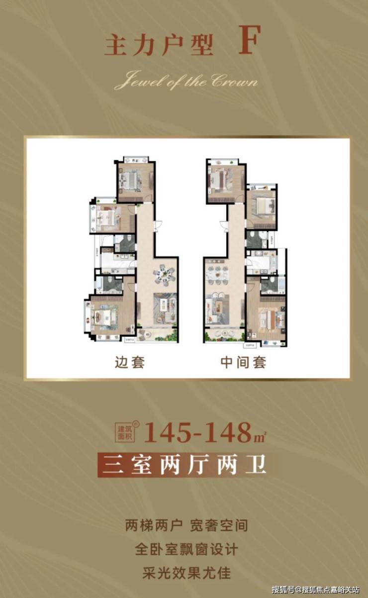 172㎡3房2厅3卫:横厅设计,7米宽幕阳台,270° 转角飘窗,双主卧套房 + 独立家政间,终极改善天花板,仅18套。