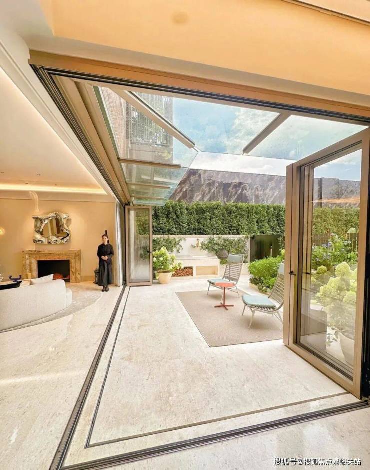 「无界空间」:客厅270度转角无柱设计,搭配落地玻璃,开阔视野将院中风景迎入日常。