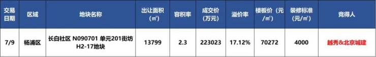 2024年7月,杨浦区长白社区H2-17地块经过79轮的举牌,最终由北京城建&越秀斩获!总价223023万,楼面价70272元/㎡,溢价率约17.12%!
