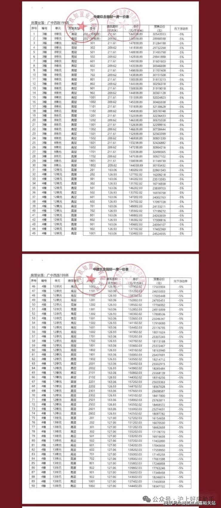 中建玖上琅宸前期一房一价表: