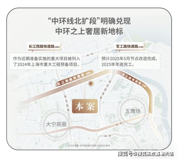 中环线北扩段明确兑现,军工路快速路25年开工,长江西路快速路列入上海市重大工程清单预备项目,快速链通城心,随着中环线北扩段的政策明确,淞南将正式进入中环时间。未来经逸仙高架,进入南北高架、内环高架、中环高架,可快速链通南北上海;多维立体路网全面升级,未来区域价值再攀新高。