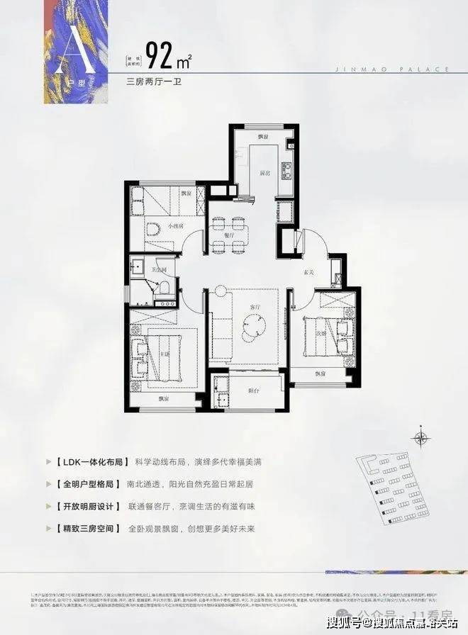 建面约92㎡3室2厅1卫户型,做到了 三开间朝南+LDK一体化布局,延伸了室内实际可使用面积,采光、通透性都非常不错。